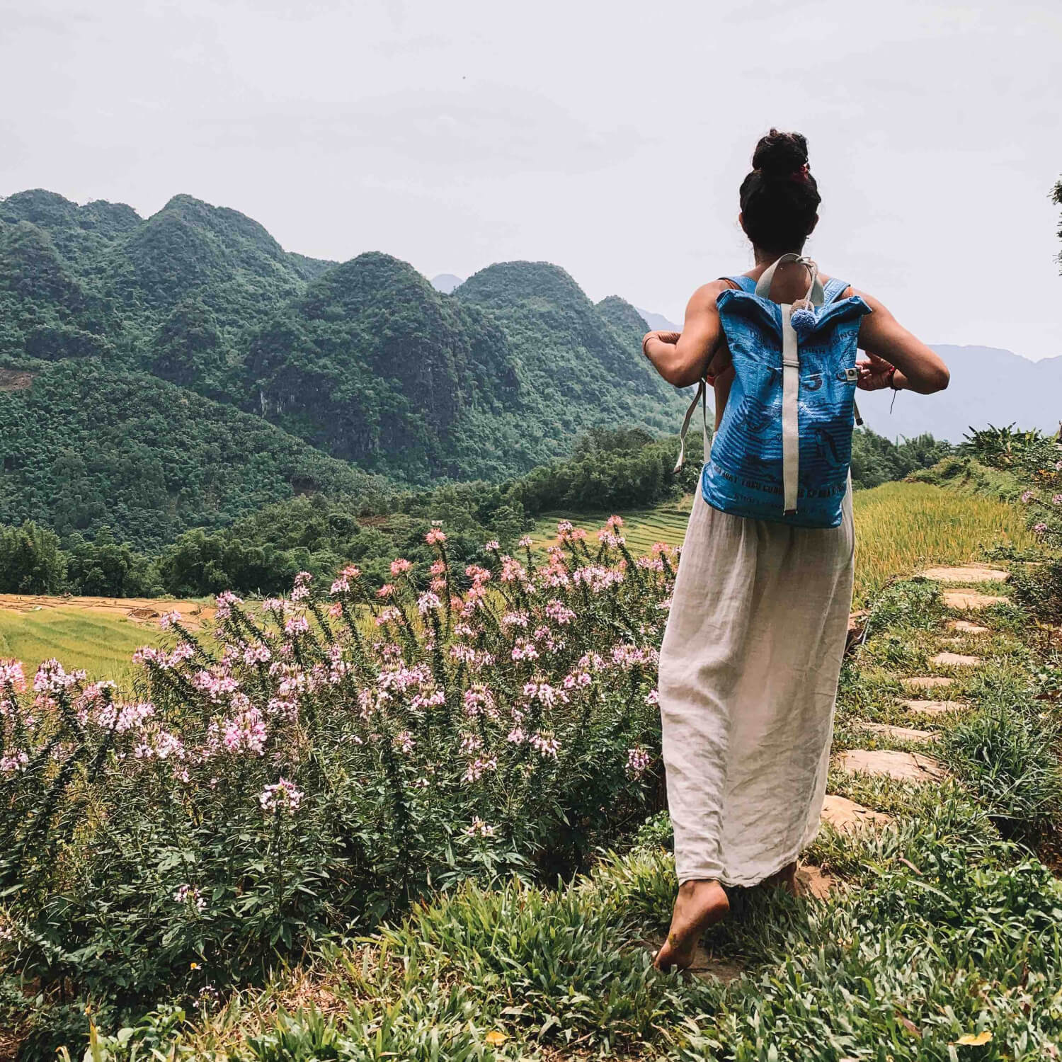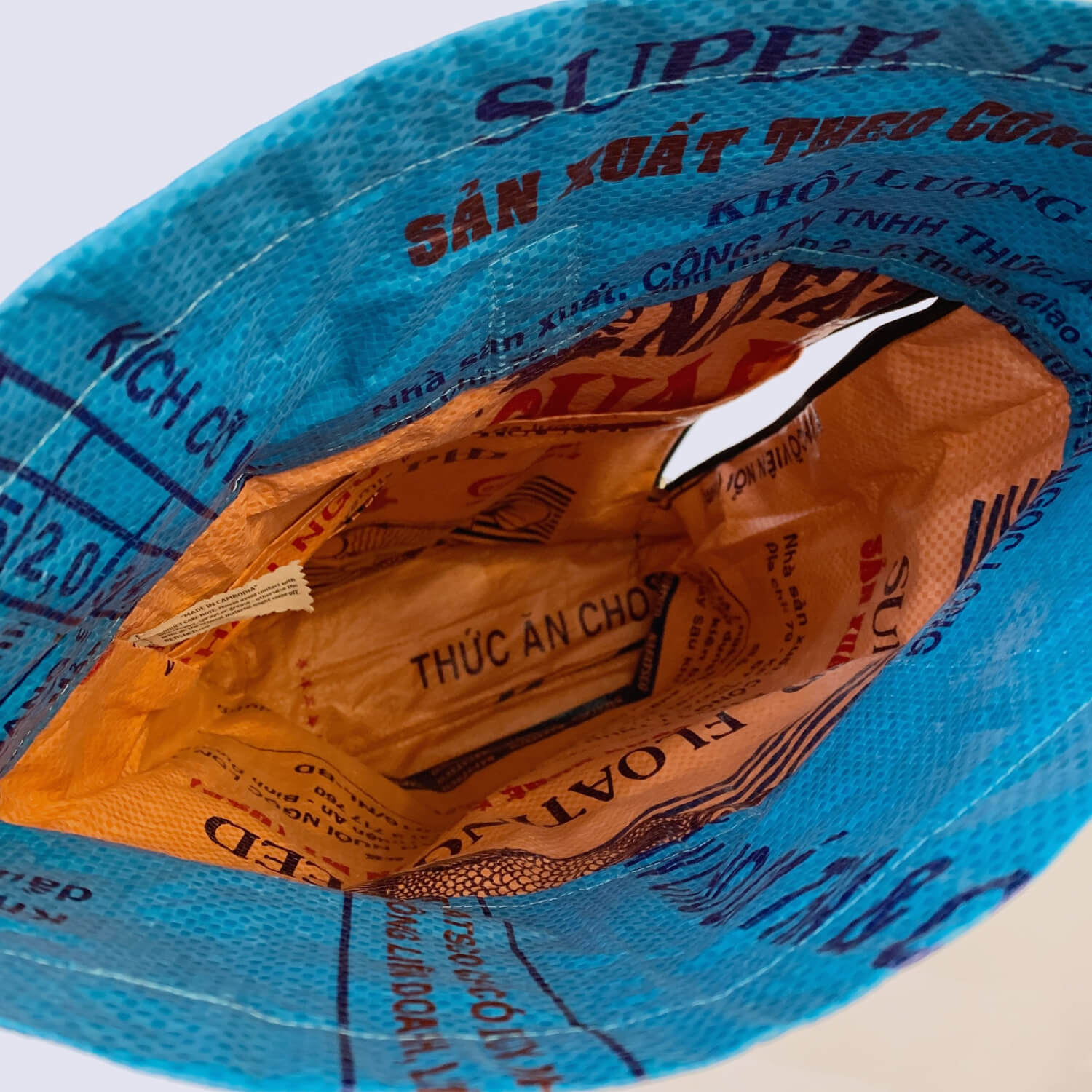 Stylischer Rucksack aus upcycelten Fischfuttersäcken mit 22l Fassungsvermögen, perfekt für den modernen Stadtmenschen im Alltag. Hier passen Laptop und alle deine Dokumente rein. Einfach cool!